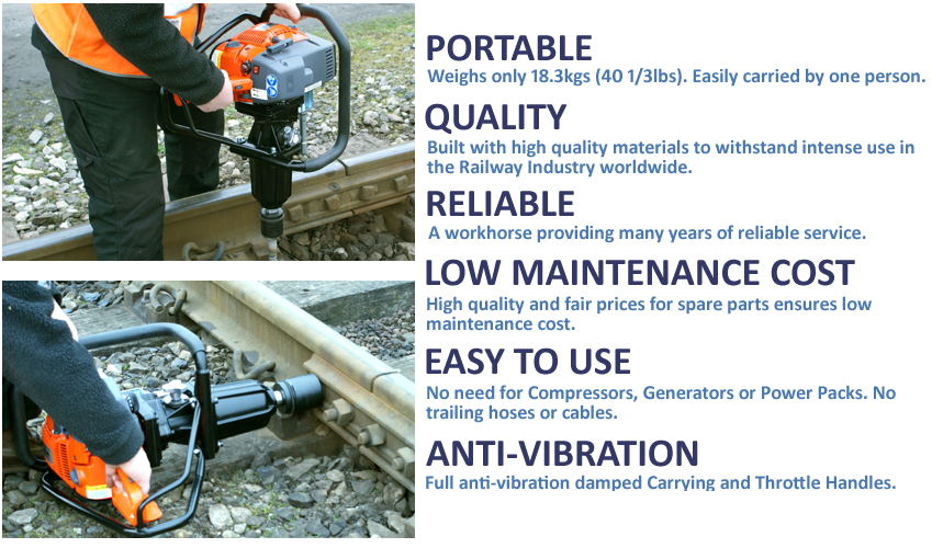 The Master is easy to use and repair, is light, powerful and because it can loosen/tighten a fastener in under seven seconds generates low levels of hand arm vibration. We also developed a Quick Release Safety Auger Attachment which allows the Master to be converted into a Wooden Sleeper/Tie Drilling Machine. Although used primarily for railway applications it is increasingly used by other industries e.g. Trucking, Farming, Forestry, Scrap Metal Recovery and Steel Tower maintenance where it is difficult to use traditional sources of power
